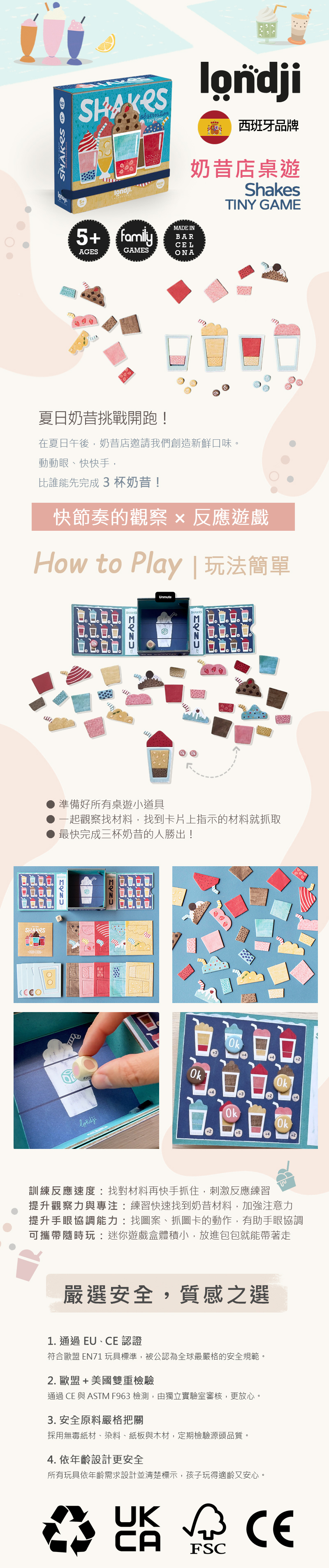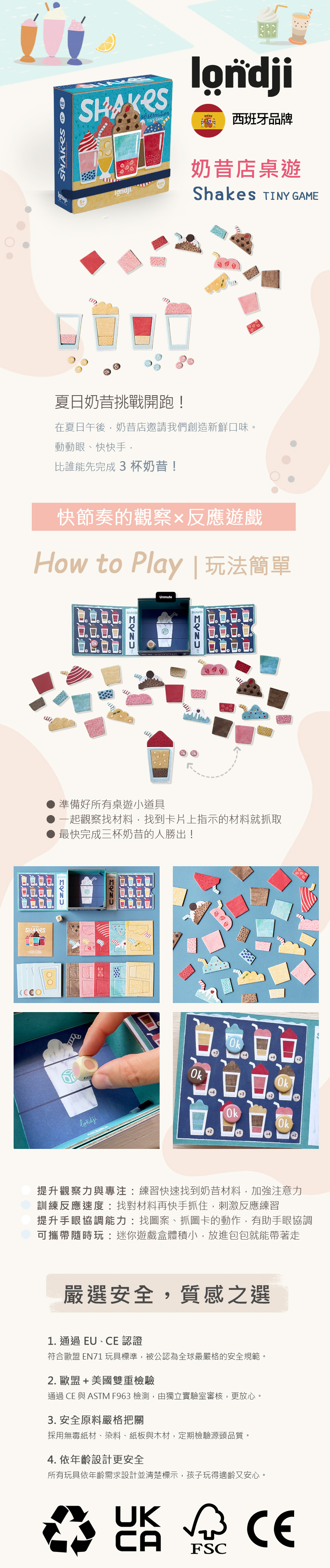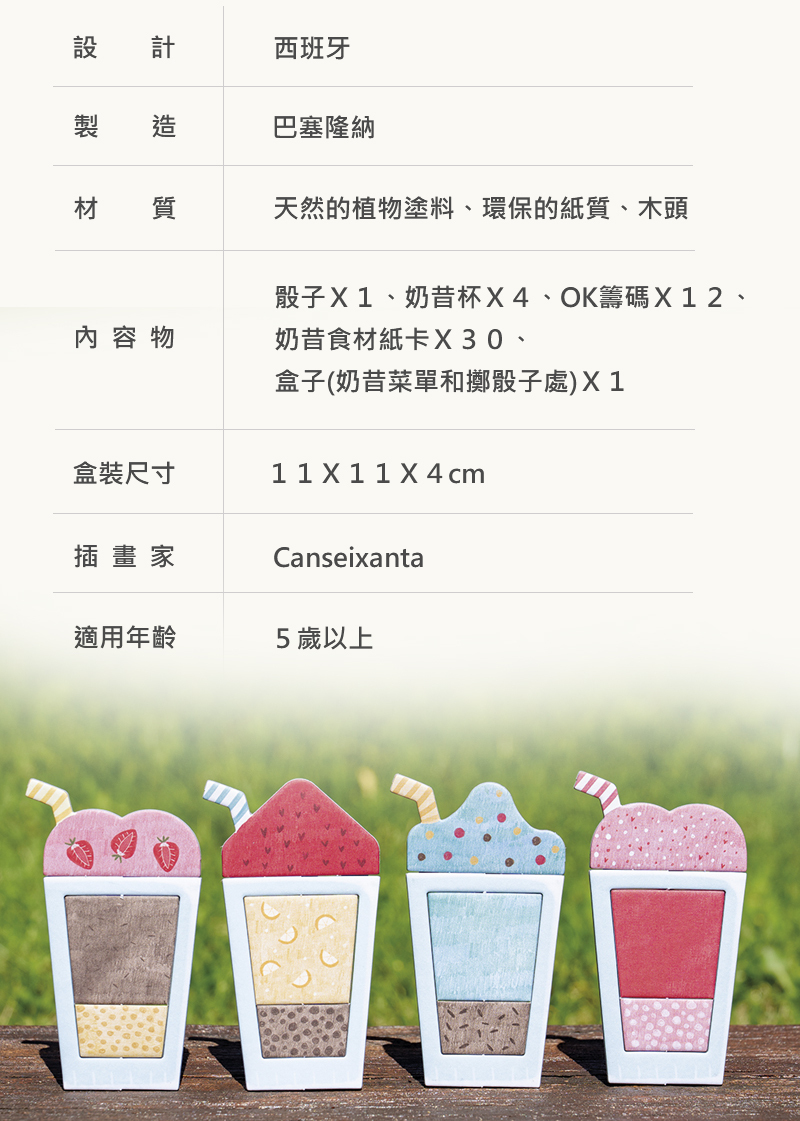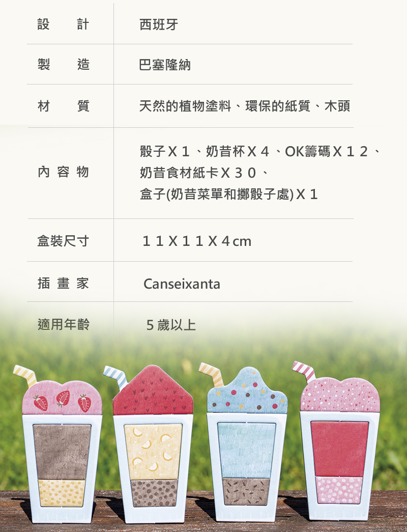 內容物:1個彩色骰子、4個奶昔杯、30個奶昔遊戲紙卡、12個OK籌碼、1個盒子(印有奶昔菜單和可擲骰子)