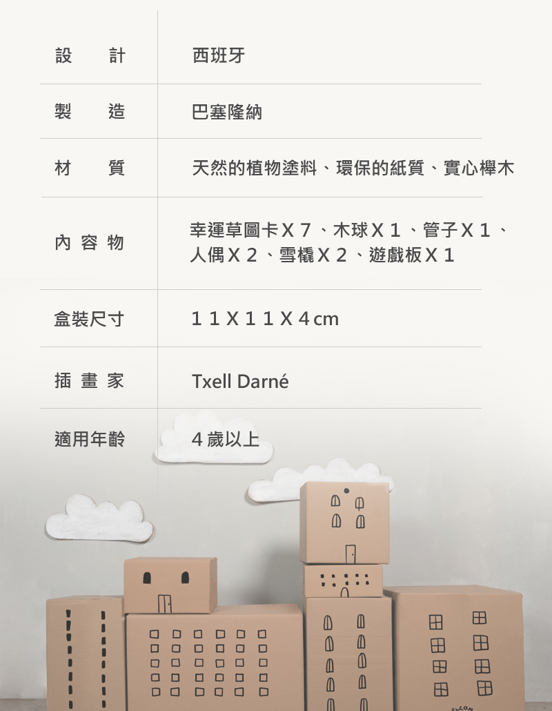 內容物:幸運草圖卡x7、木球x1、管子x1、人偶x2、雪橇x2、遊戲板x1