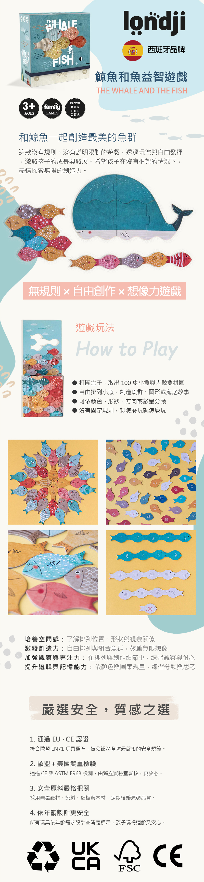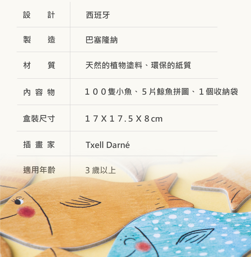 內容物:100隻小魚、5片鯨魚拼圖、1個收納袋