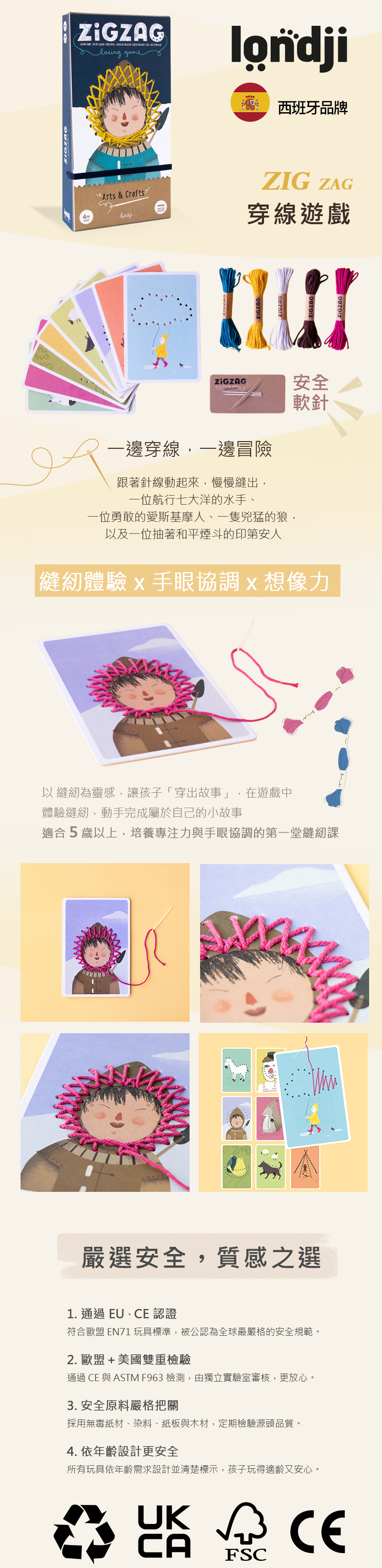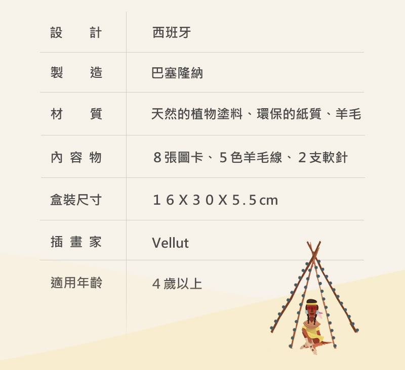 內容物:8張圖卡、5色羊毛線、2支軟針