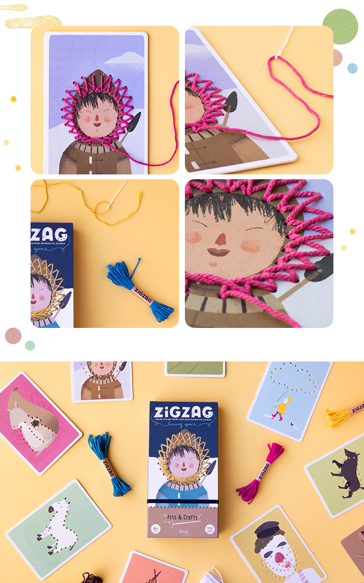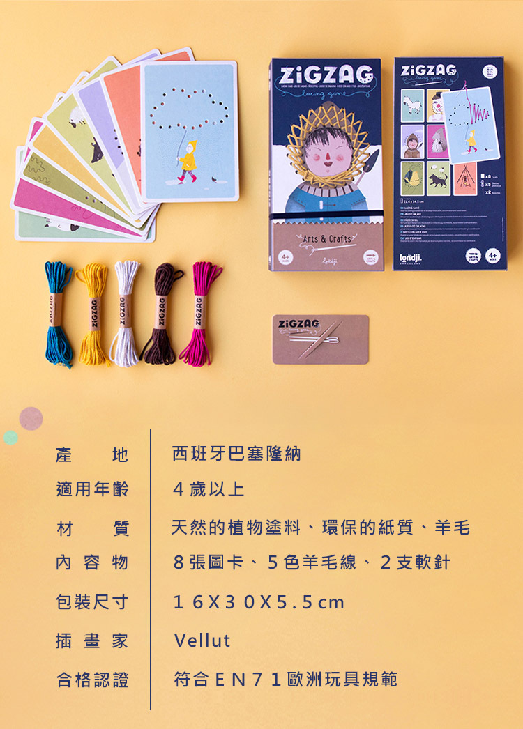 內容物:8張圖卡、5色羊毛線、2支軟針