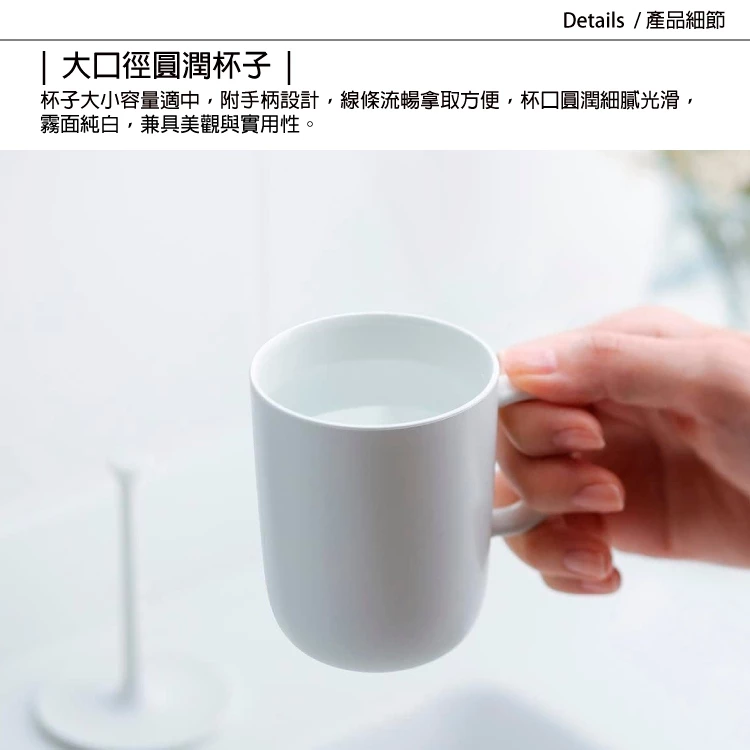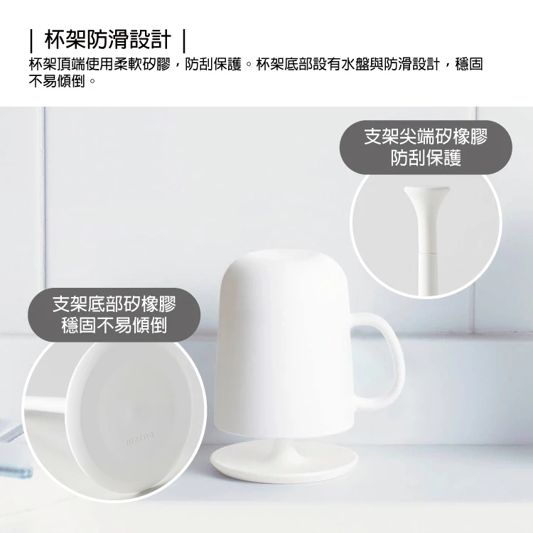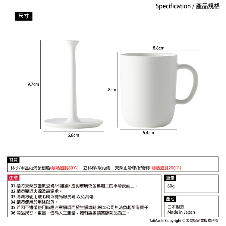 材質:杯子-甲基丙烯酸樹脂(耐熱溫度80°C)/ 立杯桿-聚丙烯/支架止滑球-矽橡膠(耐熱溫度200°C)