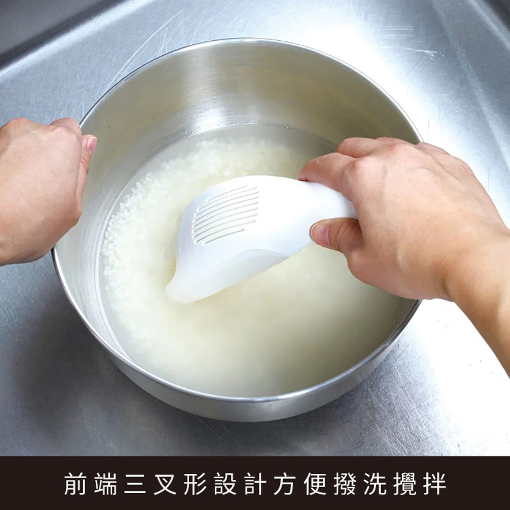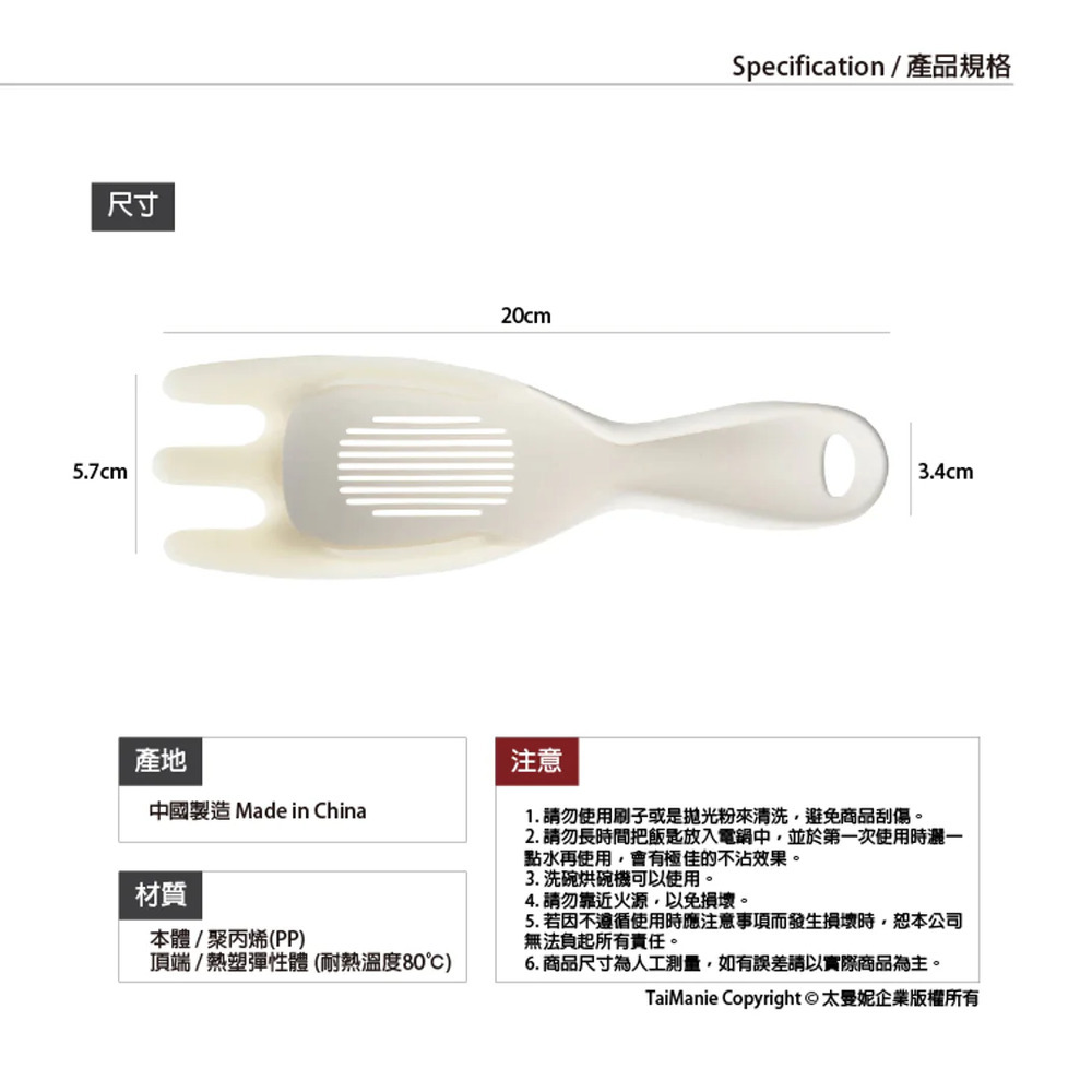 2. 請勿長時間把飯匙放入電鍋中,並於第一次使用時灑一點水再使用,會有極佳的不沾效果。