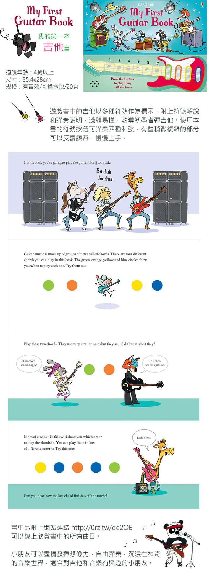 透過新穎有趣的彈奏設計,認識吉他樂器,有和弦及音樂的音效,吸引幼童對樂器的興趣,好玩又有趣,適合剛開學習音樂的小朋友。