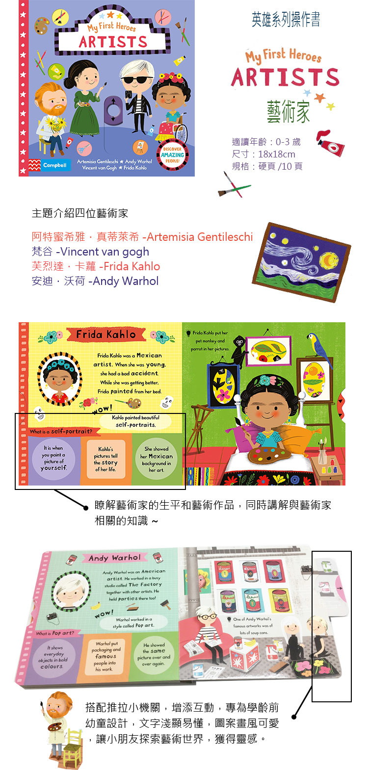 主題介紹知名藝術家,講述相關的知識,搭配推拉小機關,增添互動,專為學齡前兒童設計,讓小朋友探索藝術世界。