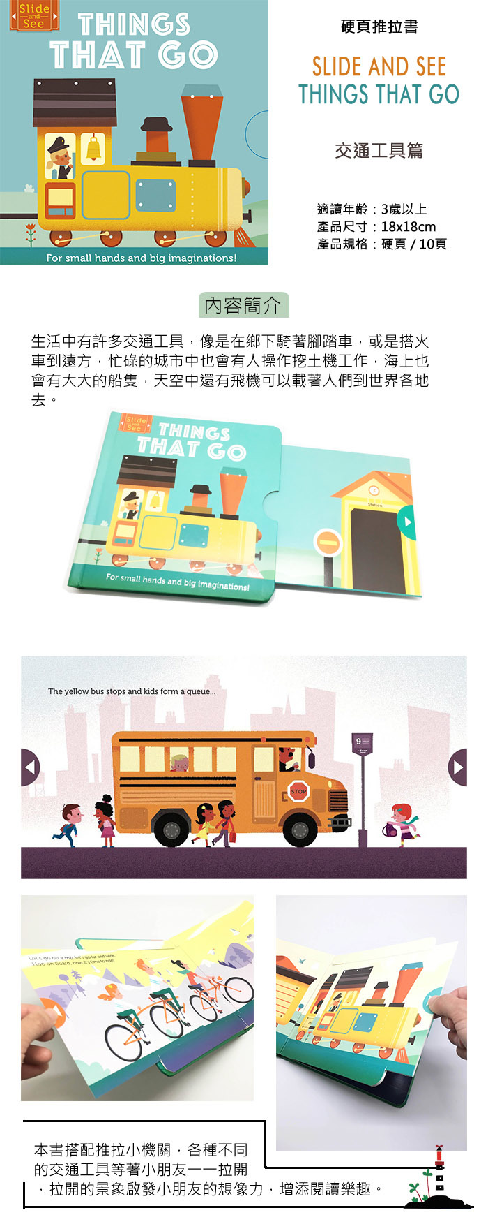 書本中推拉小機關設計,跟著箭頭指示拉開,會發現許多新奇有趣的主題場景,吸引小朋友的注意力,認識交通工具,增添閱讀樂趣。