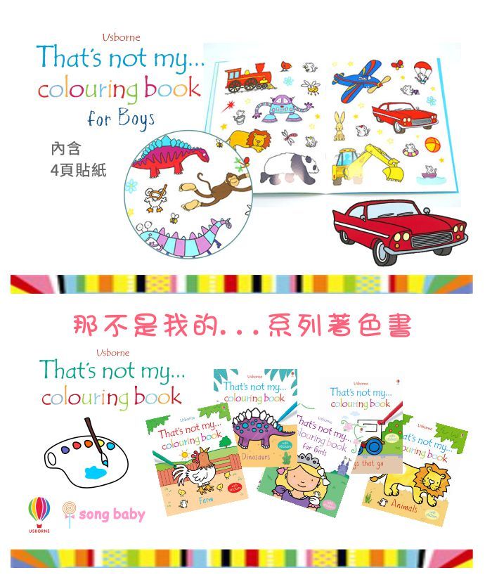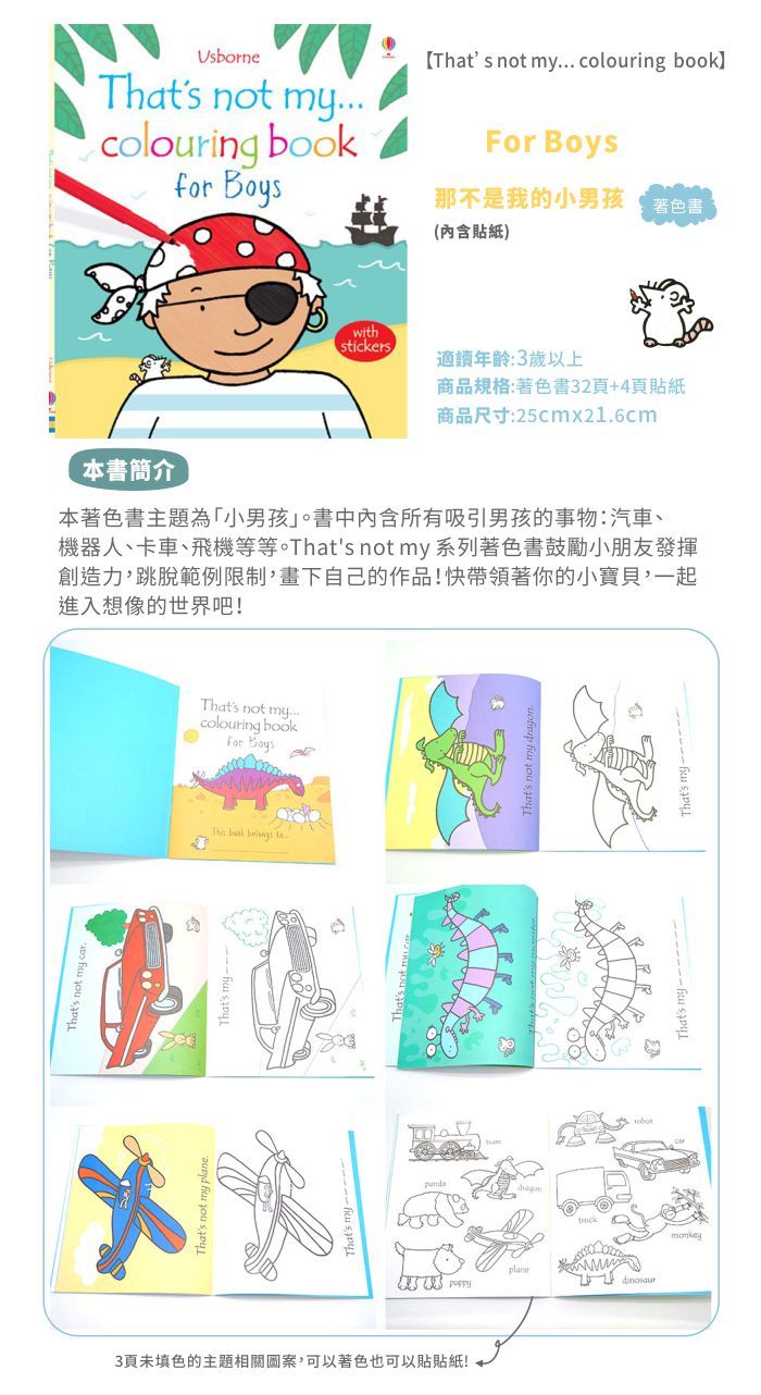 That's Not My系列的著色本,搭配不一樣的主題內容,小朋友可依照範例圖案,塗上鮮艷的顏色,和書中主角一起進入新奇的彩繪世界。