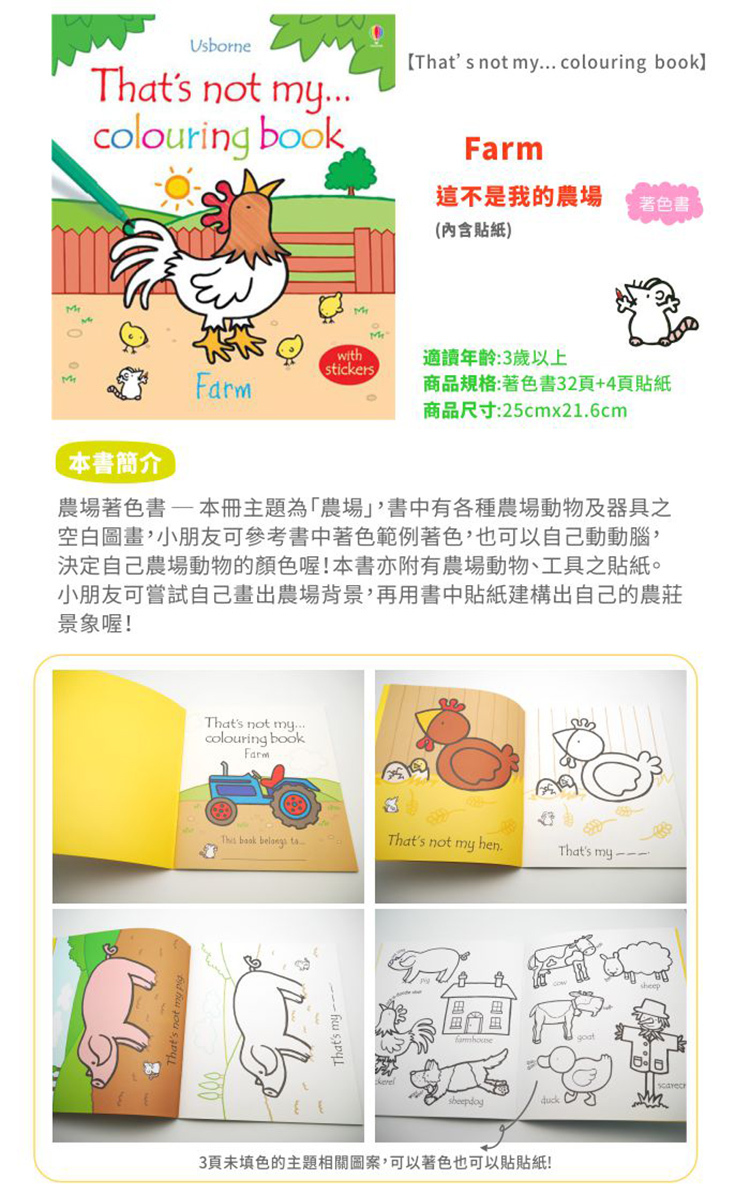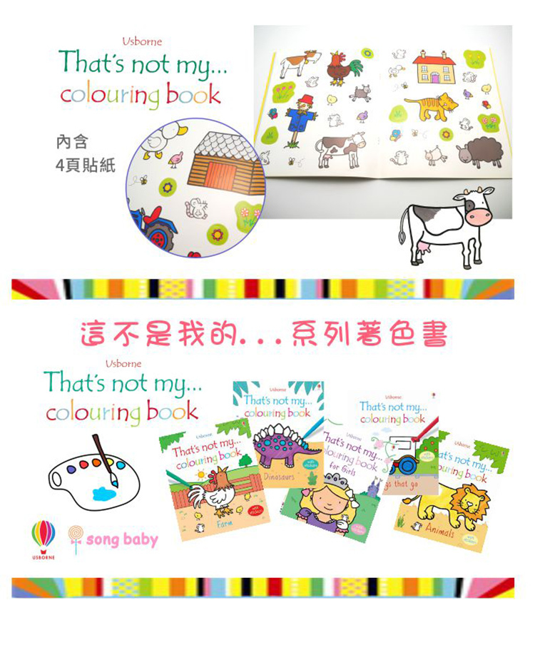 That's Not My系列的著色本,搭配不一樣的主題內容,小朋友可依照範例圖案,塗上鮮艷的顏色,和書中主角一起進入新奇的彩繪世界。