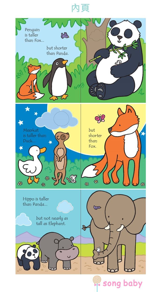書本中介紹關於大和小的對比,透過各種動物們長高對比的差異,認識高度的概念,並附有一張身高測量尺及備忘貼紙,一起記錄下寶貝的成長軌跡。