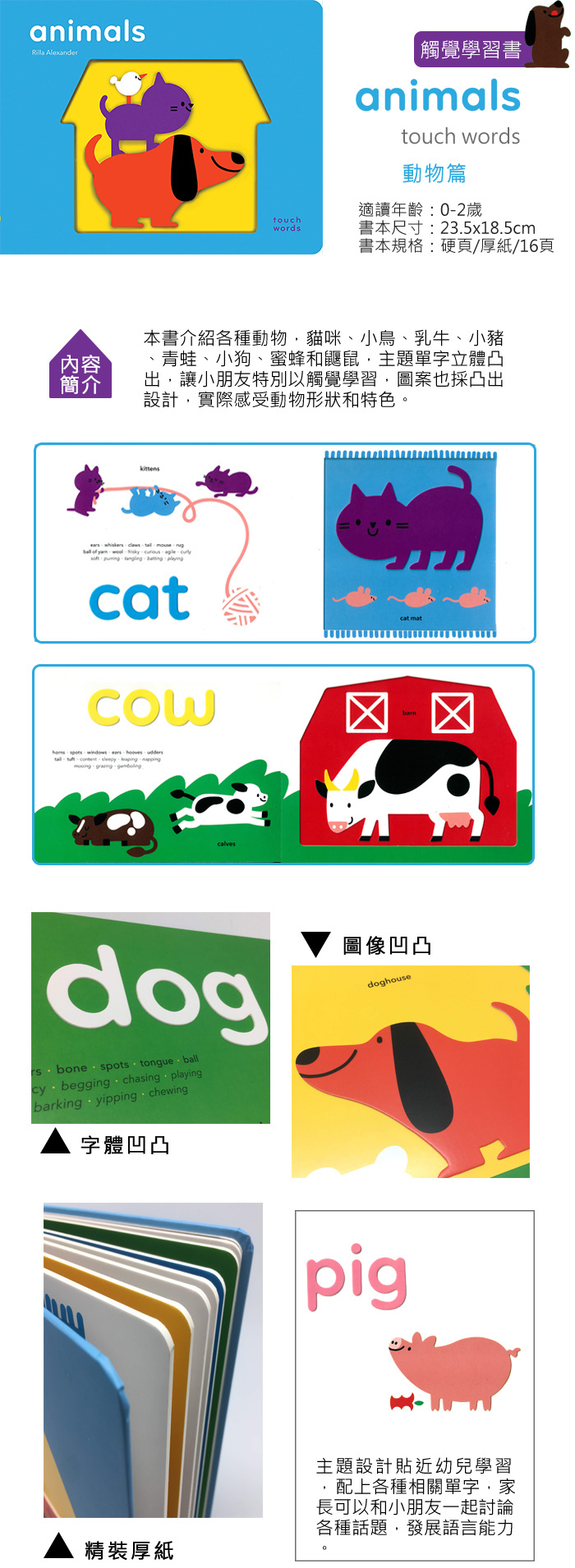 啓蒙書中的主題設計鮮明呈現,基本色調及可愛圖像,增添閱讀的豐富性,家長陪同簡單閱讀,培養親子感情。
