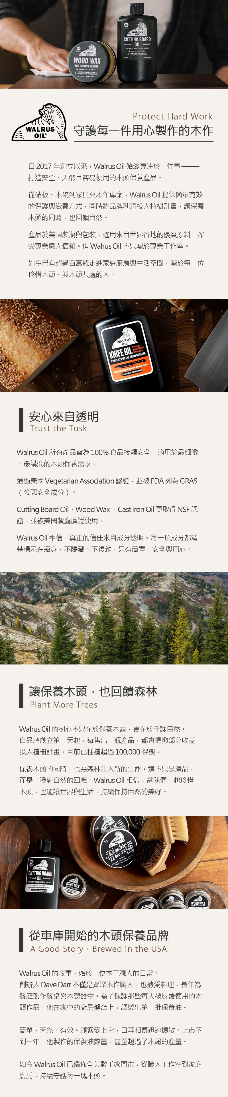 來自美國的 Walrus Oil,專注於天然、安全且食品接觸安心的木頭保養,為日常使用的原木器物提供滋養與防護,讓木頭恢復溫潤光澤,延長使用壽命。木頭不是消耗品,而是值得被細心照顧的生活器物。
